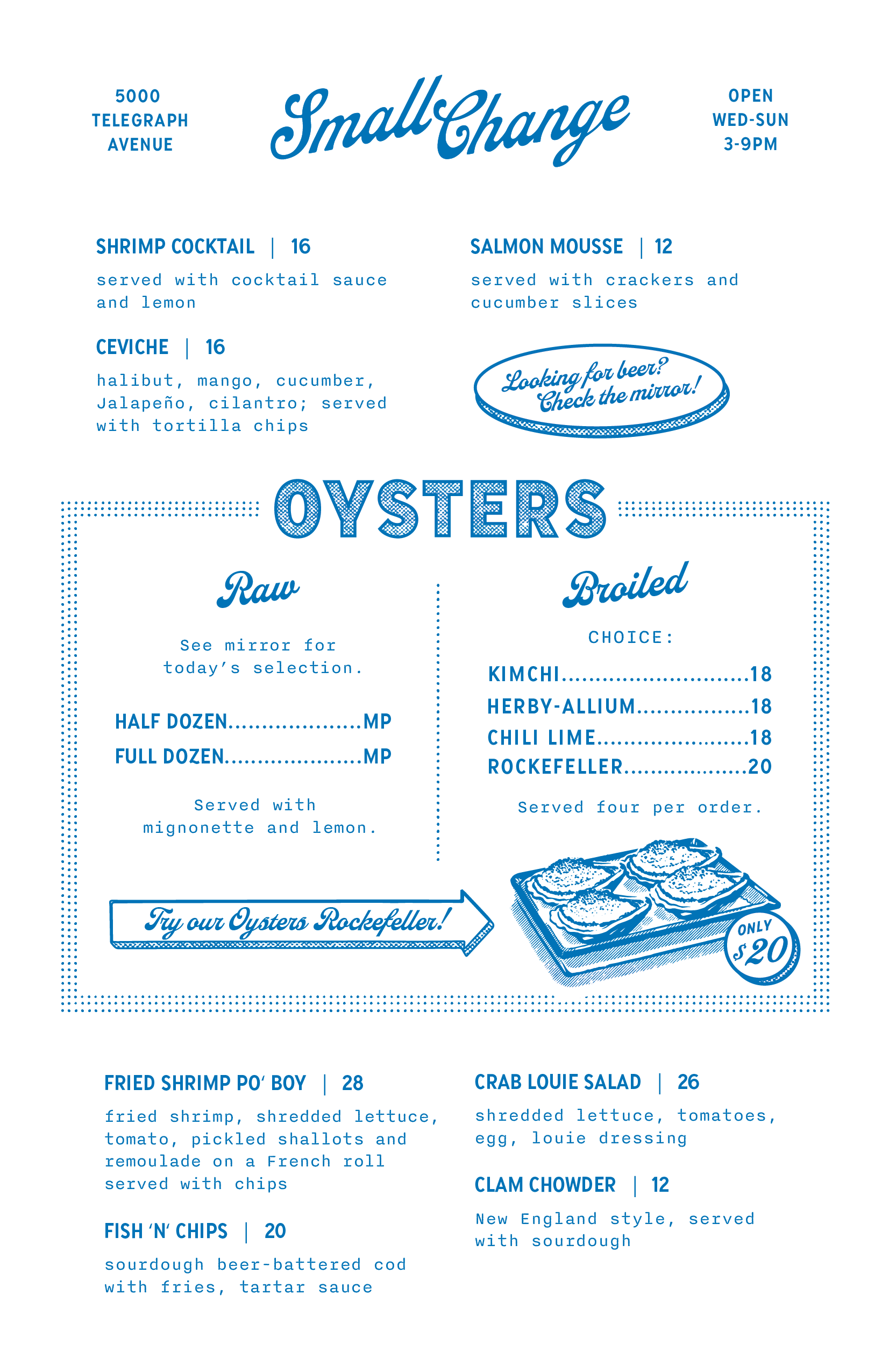 Small Change embodies family history and a love for oysters. Owner Branden Nichols' connection to the ocean began in childhood, voyaging to the Farallons on his grandfather's boat, affectionately named "Small Change." This name, a playful nod to their families last name, “Nichols” and what was left in his grandfather’s pockets after purchasing his boat, reflects the essence of their maritime adventures.